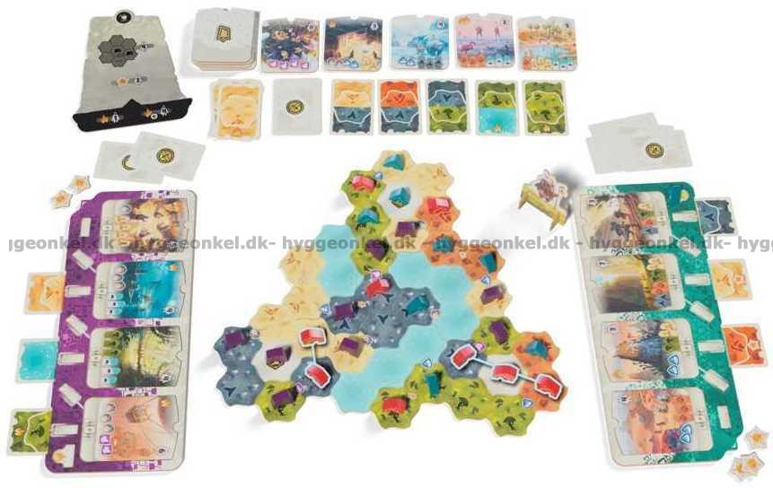 Under resans gång etablerar ni läger i landskapets olika zoner och sätter ert avtryck på territoriet. På vissa platser kommer ni närmare livsviktiga bär, på andra till värdefulla resurser som kristaller, pigment och artefakter. Era berättelsebrickor representerar de mål och visioner som formar stammen, och genom era val och placeringar växer historien om ert folk fram. Varje läger är ett nytt kapitel, och varje resurs är ett steg mot att uppfylla den berättelse ni vill förverkliga.