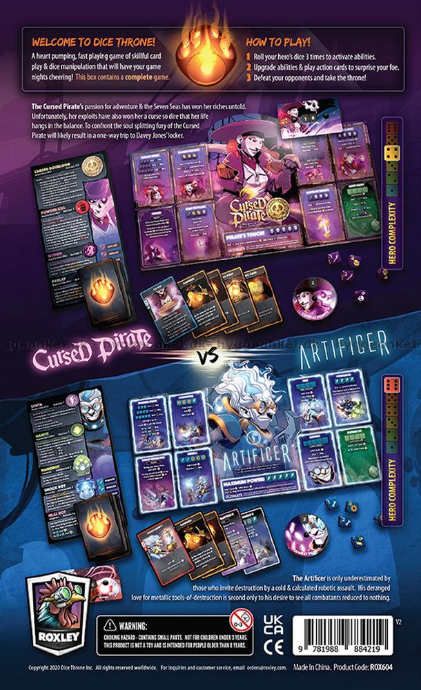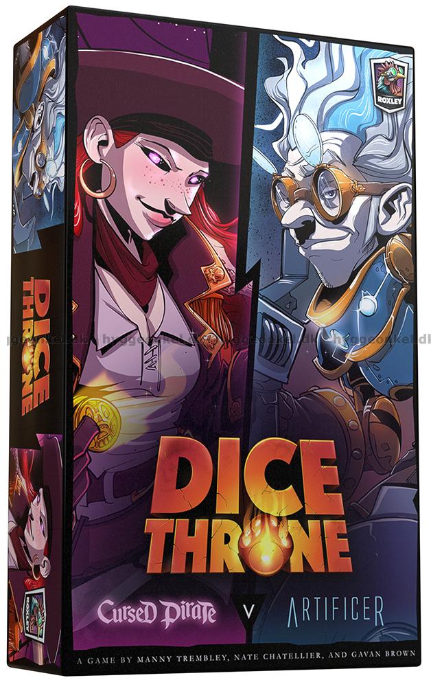 Dice Throne: Artificer vs Cursed Pirate skapar en medryckande uppgörelse mellan brutal, ostyrbar kraft och sval, mekanisk precision. Den Förbannade Piraten slåss med kraftfulla cutlass-slag och explosiva krutfat, drivna av hennes förbannade dubbelmynt, men varje seger har sitt pris när hennes egen livskraft långsamt urholkas. Artificiern tar en helt annan väg och bygger upp ett arsenal av robotar som med noggrant planerad effektivitet bryter ner motståndaren bit för bit. Tillsammans ger de två hjältarna en dynamisk duoupplevelse full av tempo, taktik och överraskningar.