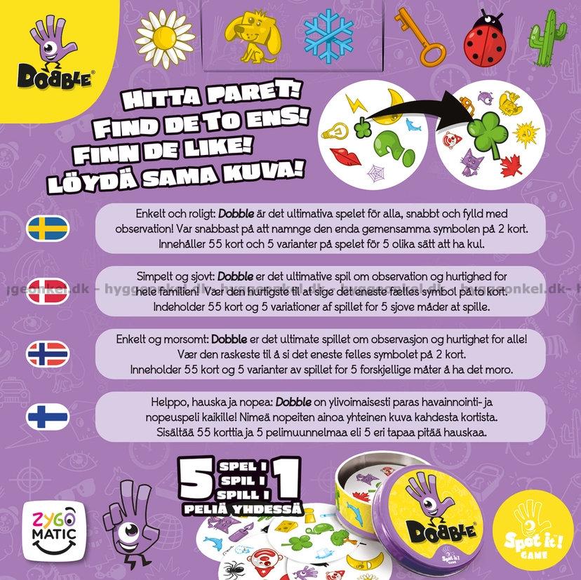 Det medföljer spelregler till fem olika små trevliga spel. I alla spelen handlar det om att hitta en identisk uppsättning symboler på två kort.