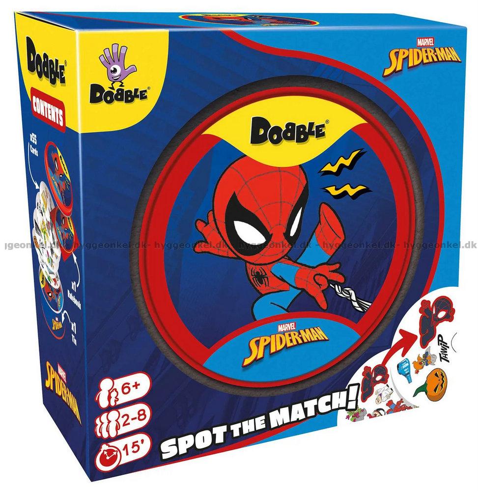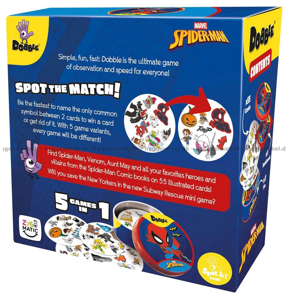 I denna utgåva av Dobble är motiven hämtade från Spider-Man-universumet.