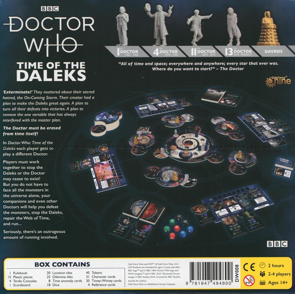 Har du någon gång drömt om att vara Doctor Who? Att kunna resa genom tid och rum, möta nya följeslagare och uppleva spännande äventyr? I Doctor Who: Time of the Daleks är det precis det du får göra. Varje spelare väljer en av de många doktorerna och försöker att förhindra Daleks planer på att utradera doktorn från tidslinjen. Har du vad som krävs för att ikläda dig rollen som Time Lord? Följ med på ett äventyr genom tid och rum i ett spel som är större på insidan…