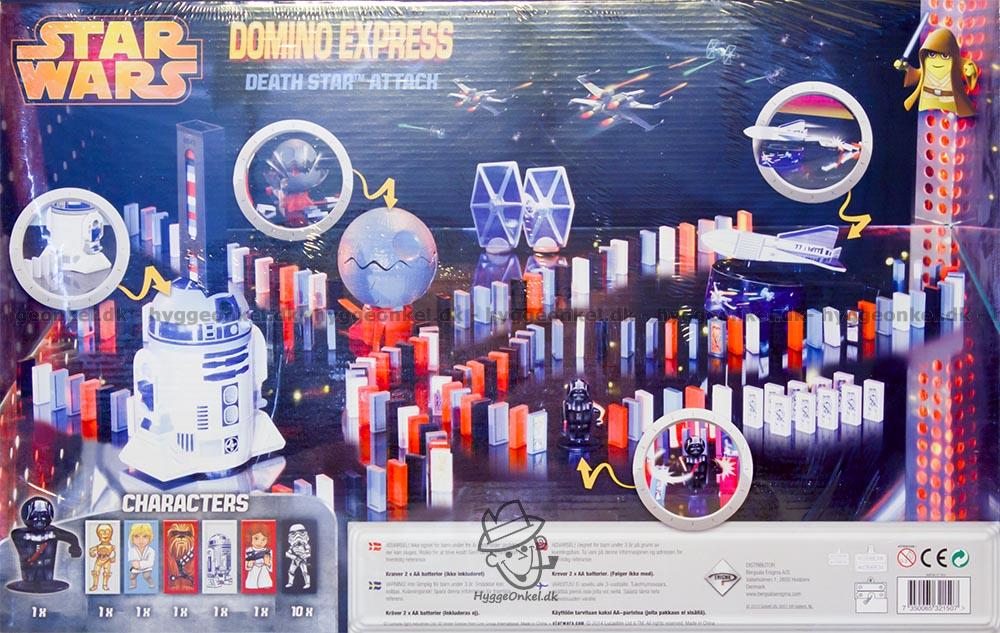 I æsken får du udover 150 domino brikker også en Dødsstjerne, stor batteridrevet R2-D2-figur, Darth Vader figur, der kan vælte brikker med sit lyssværd og andre sjove forhindringer til en flot bane.