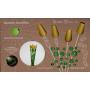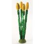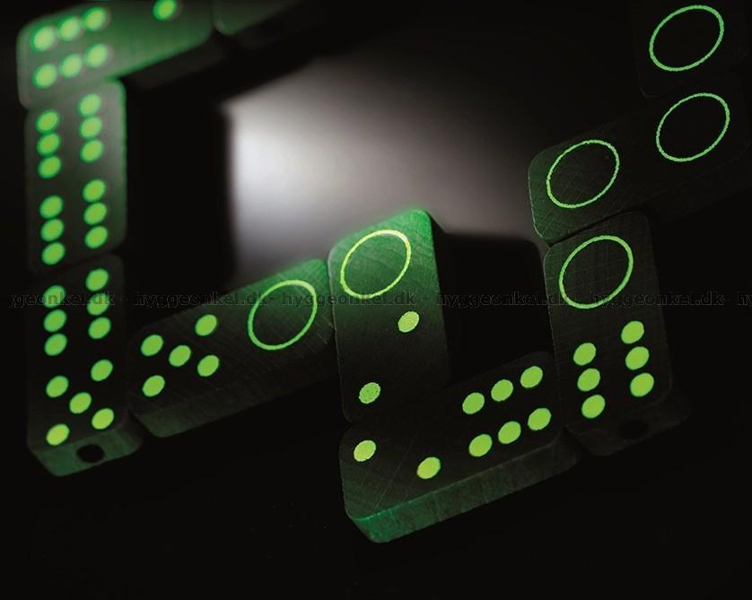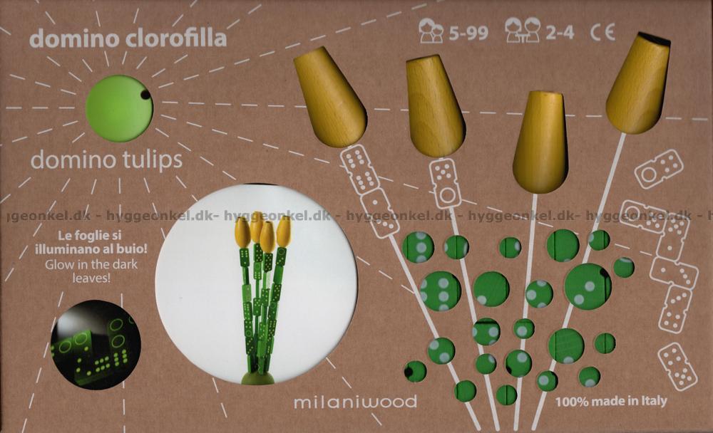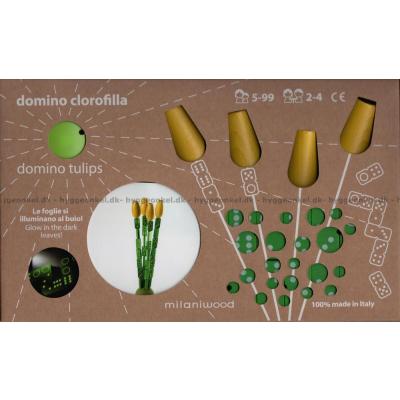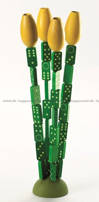 Här får du en liten kulle av "gräs" (i trä) med 4 gula tulpaner. På varje stjälk finns 7 gröna blad som också är dominobrickor. Dominobrickorna lyser i mörkret om "buketten" står på ett fönsterbräde eller liknande.