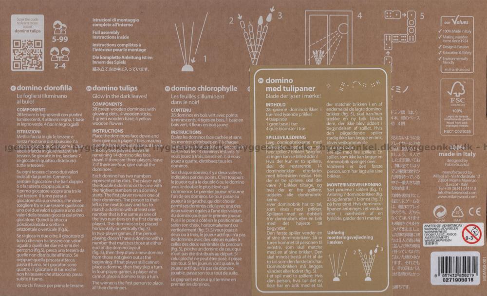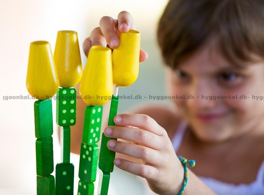 1 hållare, 4 stjälkar, 4 tulpanblommor och 28 dominobrickor (varje bricka mäter 4 x 2 x 0,7 cm). Alla delar är i trä.