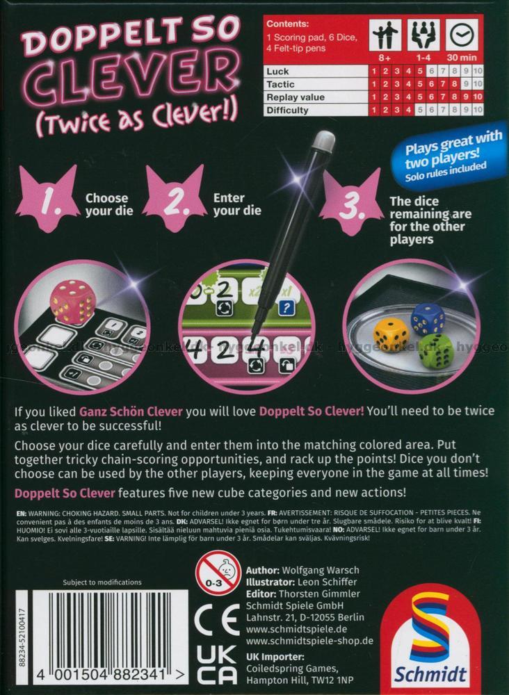 I Doppelt So Clever får du 5 nya tärningsutmaningar för avkryssning, fler kombinationsmöjligheter och dessutom en extra handling i form av ”return action” i jämförelse med Ganz Schön Clever.