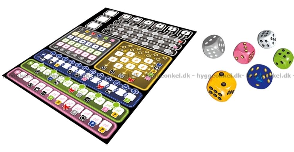 1 spelblock, 6 tärningar och penna att föra poäng med.