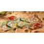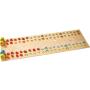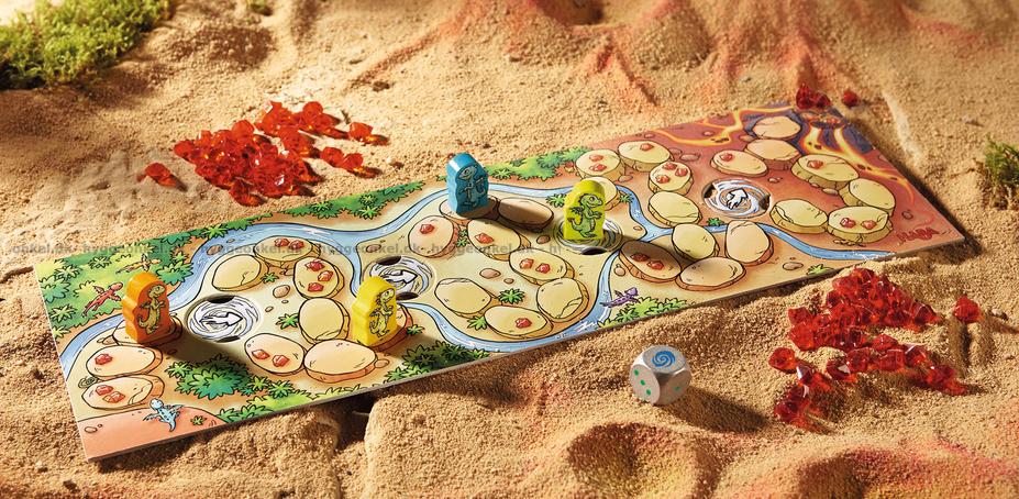 Spelbräde, pjäser i trä, brickor i kartong, tärning och kristaller.