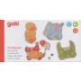 4 pussel med 6 brickor vardera samt 2 tärningar är vad som ingår i boxen. Allt är i trä. Pusslen mäter cirka 10 x 15 cm när de är kompletta.