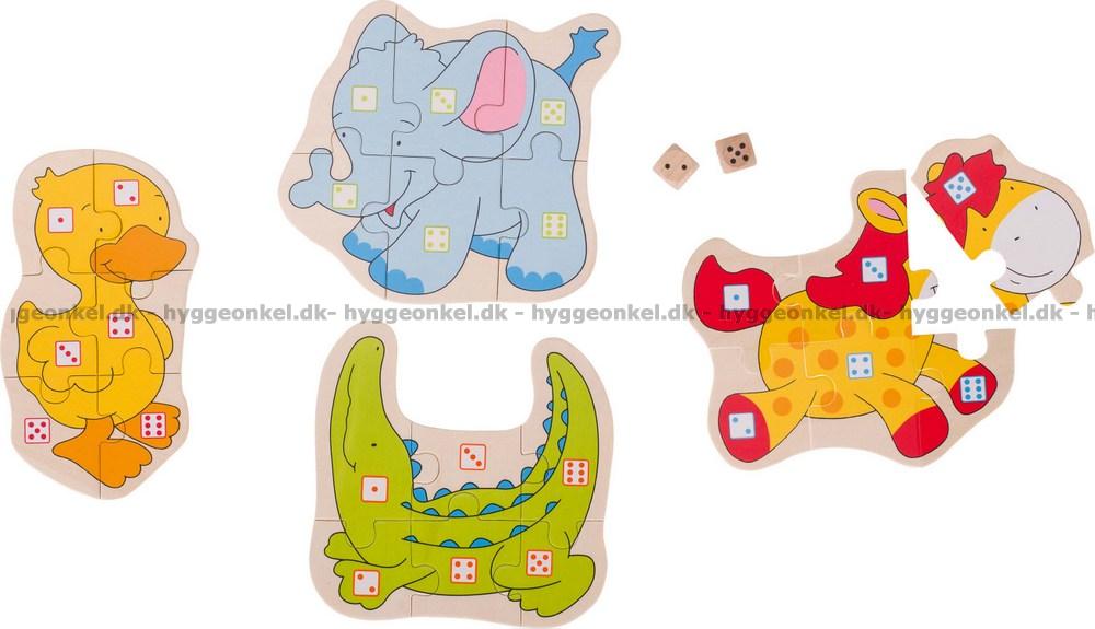 Tärningen avgör vilken bit du får ta för att placera i pusslet. Vem blir först med att få ett helt komplett djur?