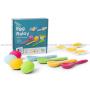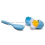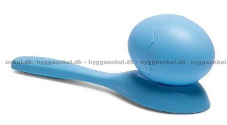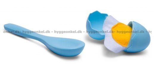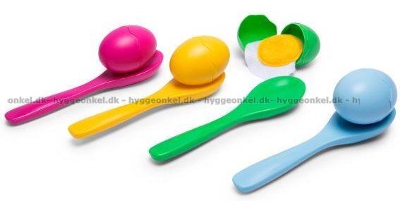 4 färgglada plastskedar (19 x 5 cm), 4 äggskal i plast (7 x 5 cm), 4 stekta ägg i tyg (9 cm i diameter).