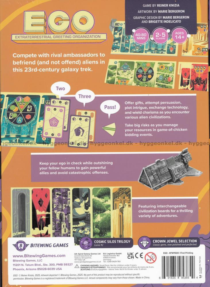 I EGO (Extraterrestrial Greeting Organization) tar spelarna rollen som ambassadörer som representerar mänskligheten i mötet med mystiska utomjordiska civilisationer. Spelet utspelar sig genom en rad stora och små händelser som auktioner, förhandlingar, risker och intriger, där spelarna ständigt måste balansera mod och strategi. Här gäller det att imponera på främmande raser, uppnå politiskt inflytande och säkra sig allierade genom att erbjuda gåvor, dela teknologi och använda både charm och list. Men oförsiktiga drag kan snabbt vända lyckan och leda till pinsamma eller katastrofala situationer. EGO handlar om att ta chanser – för endast de modiga når toppen i galaxens maktspel, där varje val kan leda till triumf eller total förlägenhet.