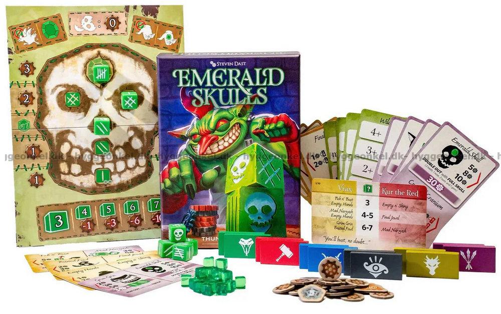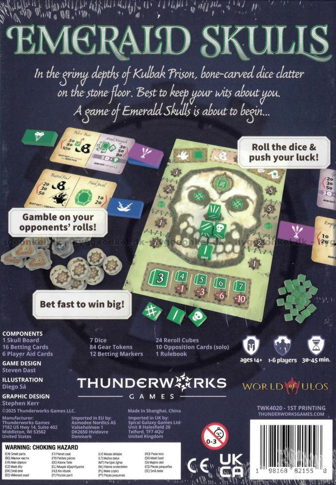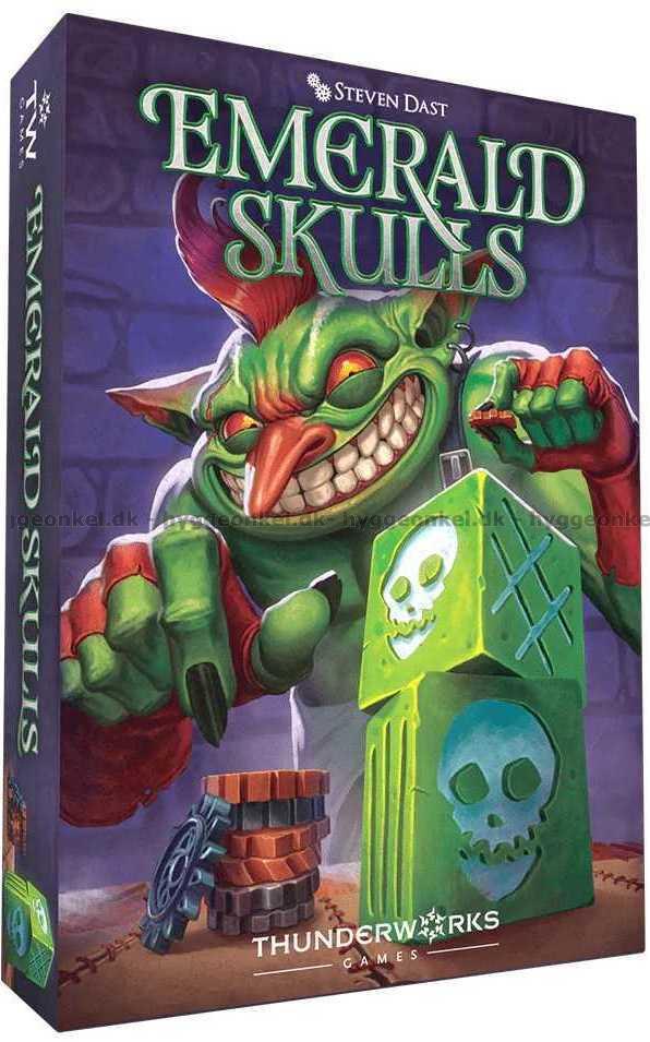 Emerald Skulls är ett intensivt tärnings- och vadslagningsspel där du kliver in i de dunkla djupen av Kulbak-fängelset. Här samlas fångarna kring goblinen Nargash och hans förtrollade ben-tärningar, medan skrik och skratt fyller de mörka gångarna. Som spelare tar du turvis rollen som tumlaren, som pressar sin tur genom att placera tärningar på kranbrädets fem nivåer, eller som gambler, som snabbt placerar vad på utgången av kasten. Ju snabbare du satsar, desto större kan vinsten bli, men risken är alltid närvarande – för en Bust Out kan bli dyr.
