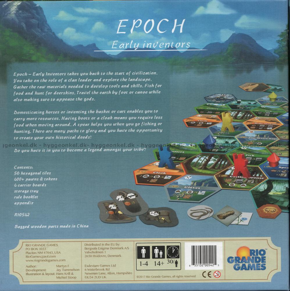 Den prisbelönta speldesignern Martyn F tar oss tillbaka till civilisationens vagga i Epoch: Early Inventors. Spelarna ikläder sig rollerna som ledare för stammar som utforskar landet, uppfinner nya verktyg och offrar till gudarna för att få status. Varje gång en spelare ska agera kan han eller hon antingen utveckla en bricka, offra vid en helig plats eller utföra en handling såsom att samla mat, gå på jakt, utforska eller arbeta så att spelaren kan skapa nya verktyg och ge bättre förutsättningar för stammens överlevnad. Efter 14-20 rundor utses den stam som har fått högst status till vinnare.