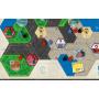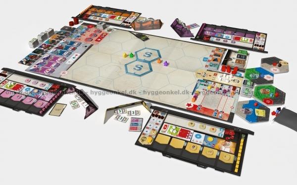 Spelbräde, individuella spelplattor, brickor i kartong, pjäser i trä och kort.