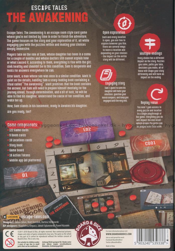 Escape Tales: The Awakening är ett kortspel baserat på "Escape Room"-konceptet. Det finns dock ingen tidsbegränsning i detta spel eftersom det fokuserar på historien och ert utforskande av den medan ni löser spelets gåtor och gör spännande val.