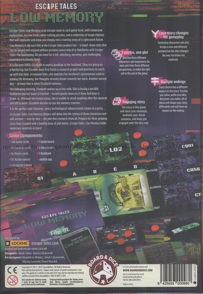 Low Memory är ytterligare en gren på stammen i serien Escape Tales, som är ett kortspel baserat på "Escape Room"-konceptet. Det finns dock ingen tidsbegränsning i detta spel eftersom det fokuserar på en historia och ert utforskande av den medan ni löser spelets gåtor och ställs inför fängslande val.