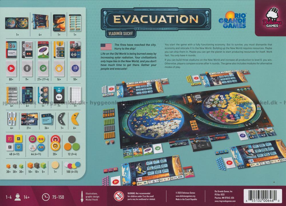 "Evacuation" utspelar sig på en döende planet där solen expanderar och hotar allt liv. Men, det finns hopp: en ny planet rik på växtliv som kan förse din befolkning med mat och syre är inom räckhåll. Varje spelare leder en nation på ett uppdrag att etablera en civilisation i denna nya värld. Konkurrensen är hård om de bästa landningsplatserna och målet är att bli först med att bygga ett nytt hem.
