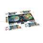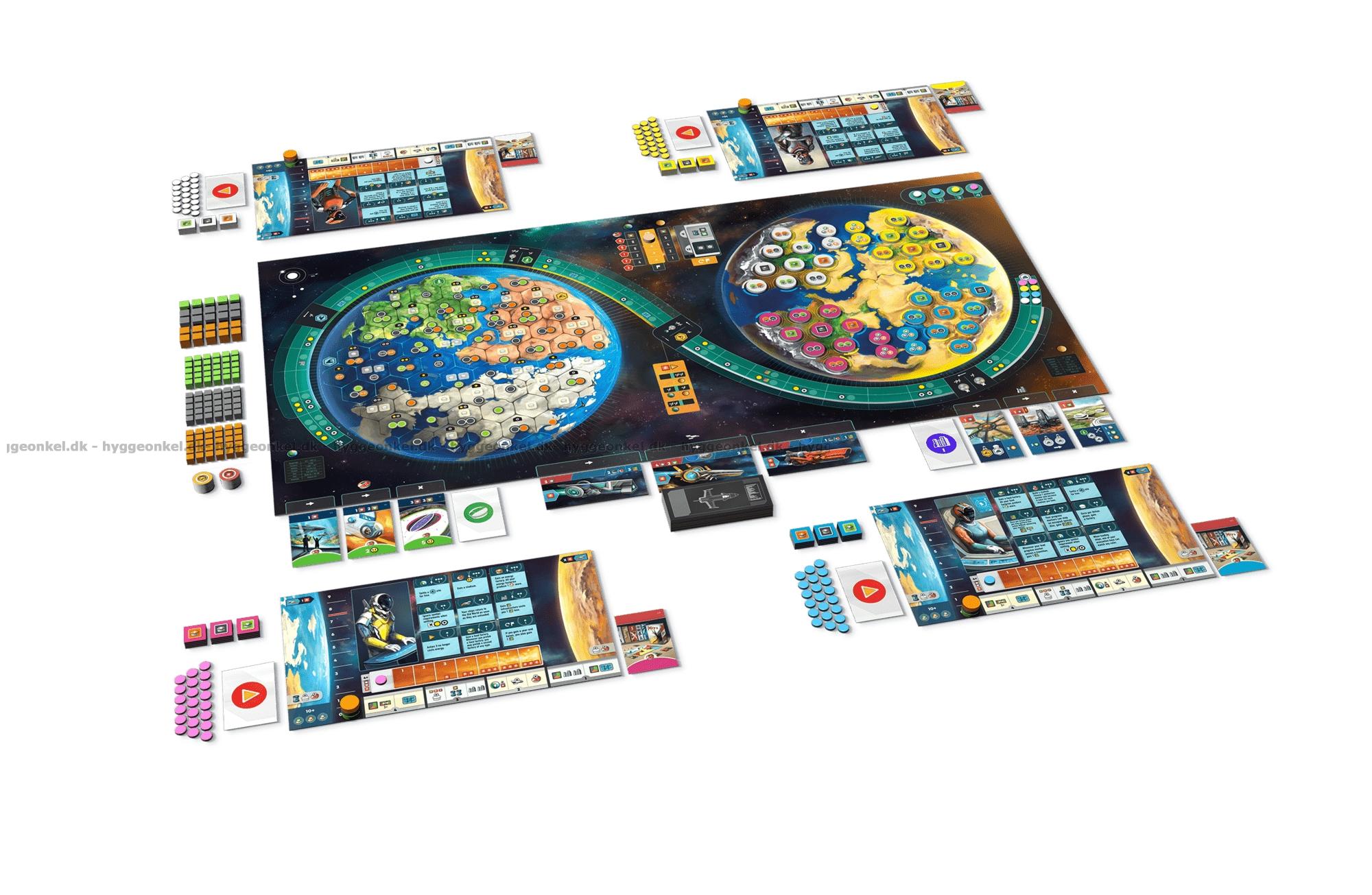 Spelområden, komponenter i trä, kort, marker i kartong och poängblock.