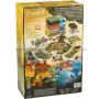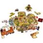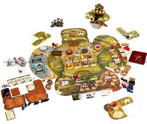 Spelområden, kort, marker i kartong, figurer i trä, tärningar och pjäser.