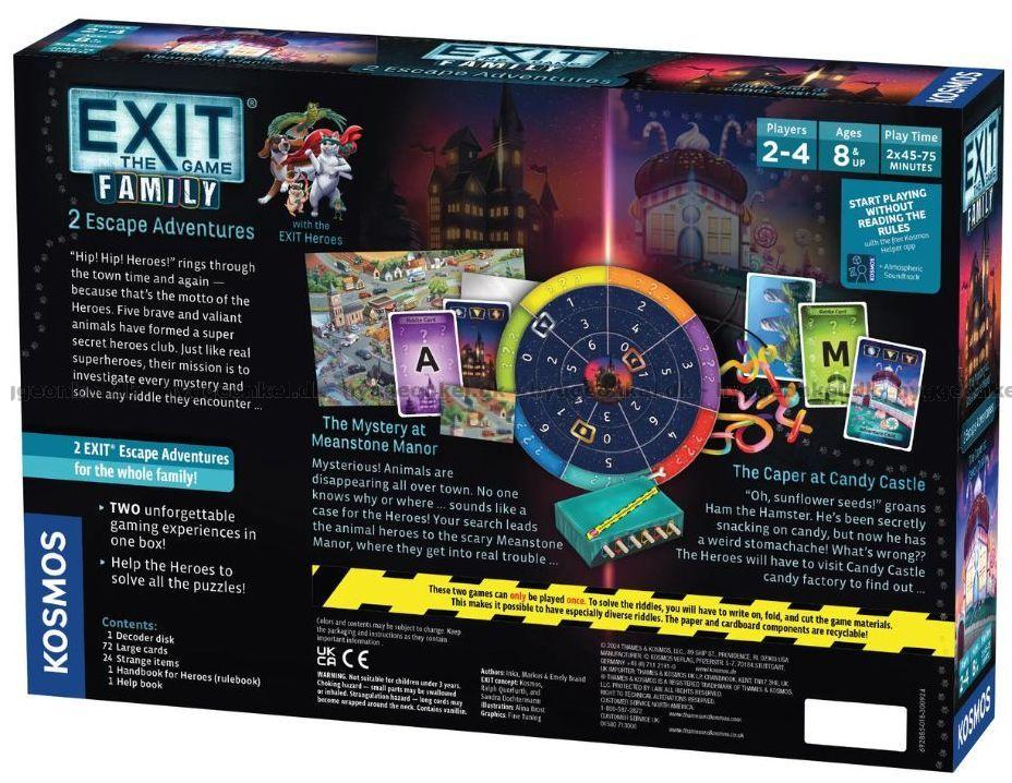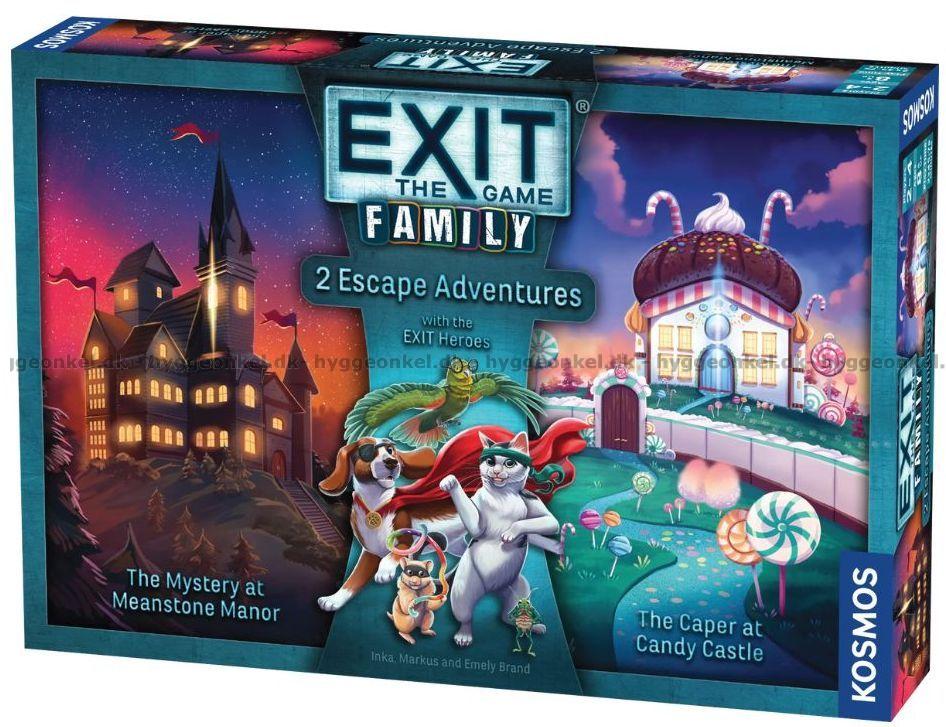 Lådan med Exit Family: 2 Escape Adventures bjuder på två hisnande äventyr i samma utgåva och är perfekt när barnen är för gamla för Exit Kids men ännu inte redo för vuxenspel.