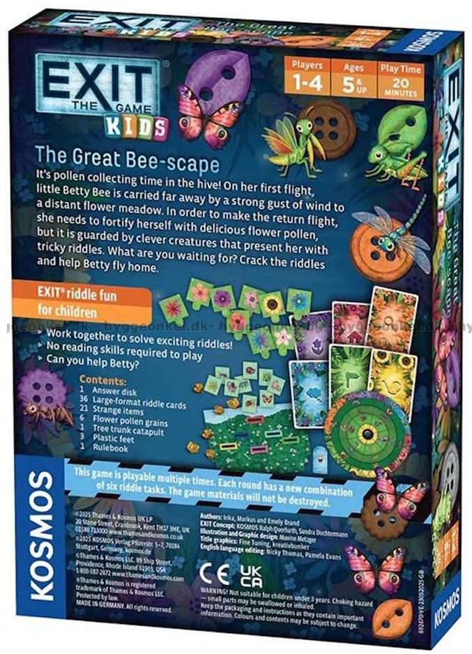 Följ med på ett färgstarkt och fantasifullt äventyr i Exit Kids: The Great Bee-scape, där det lilla biet Betty för första gången vågar sig ut för att samla pollen – men snabbt går vilse långt från sin bikupa. Mitt i en blomstrande äng, omgiven av vänliga och finurliga små varelser, börjar en resa fylld av mysterier, där det är upp till er att hjälpa Betty säkert hem igen.