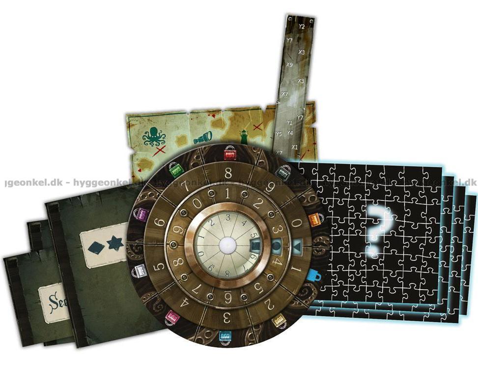 1 decoderdisk, 4 pussel med vardera 88 bitar, 12 dokument med gåtor och 2 föremål.