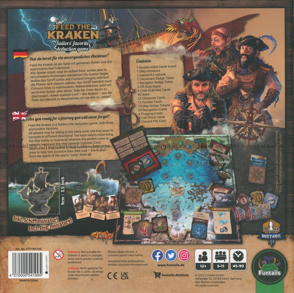 I Feed the Kraken får varje spelare en hemlig roll - Sjöman, Pirat eller galen Kultledare. Alla spelare ska försöka komma fram till vem man kan lita på och vem man definitivt inte kan lita på.