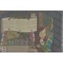 Spelbräde, kort, marker, brickor i kartong och kuber.