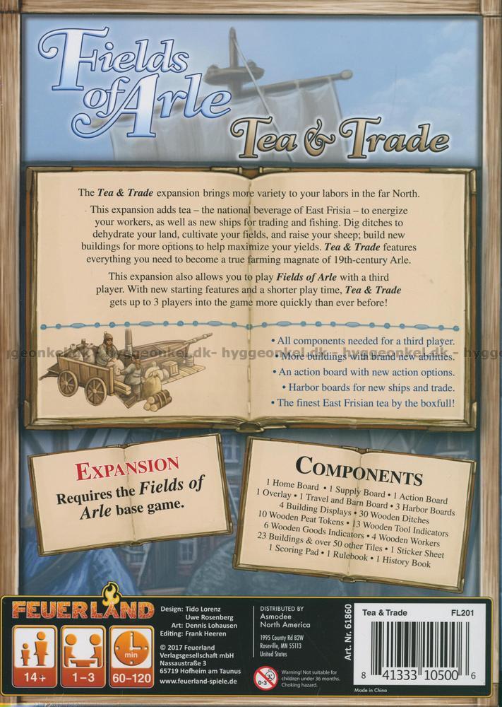 Fyll din kopp och kom igång med Tea & Trade-expansionen till Fields of Arle. Te är Ostfrieslands nationaldryck, och i denna expansion kan du använda te för att förbättra dina arbetares handlingar. Med en god kopp te kan de låtsas som att deras verktyg är mer effektiva eller göra samma handling två gånger. Utöver just te finns också en hel kanna av andra saker som du kan använda för att förbättra din gård. Gräv diken, så att du kan torrlägga land, odla dina marker och föd upp får. Eller varför inte uppföra byggnader som maximerar utbytet av ditt hårda arbete? Tea & Trade ger dig allt du behöver för att bli en storbonde i 1800-talets Arle!