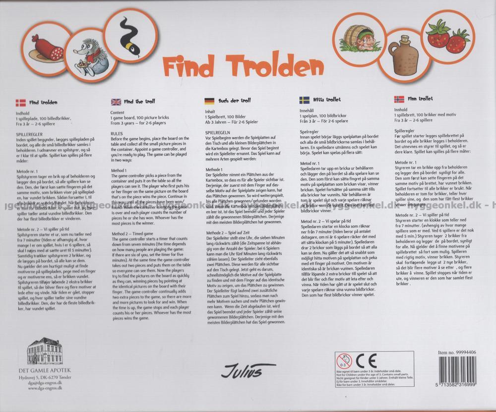 Vem blir först med att hitta trollet som gungar? Vasen med en blomma? Resväskan? Trollet som gömmer sig i en tunna? Hitta trollet kan spelas på två olika sätt.