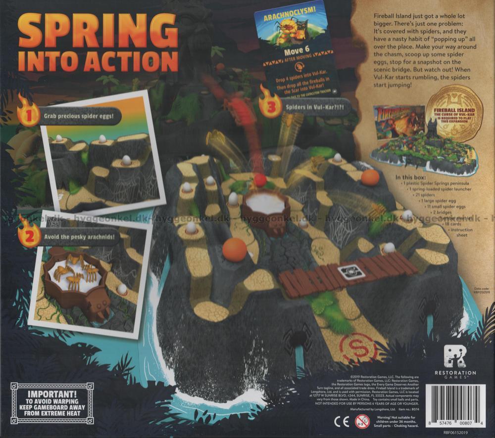 Vänligen uppmärksamma att Spider Springs är en expansion. Du måste ha grundspelet Fireball Island för att spela med den.