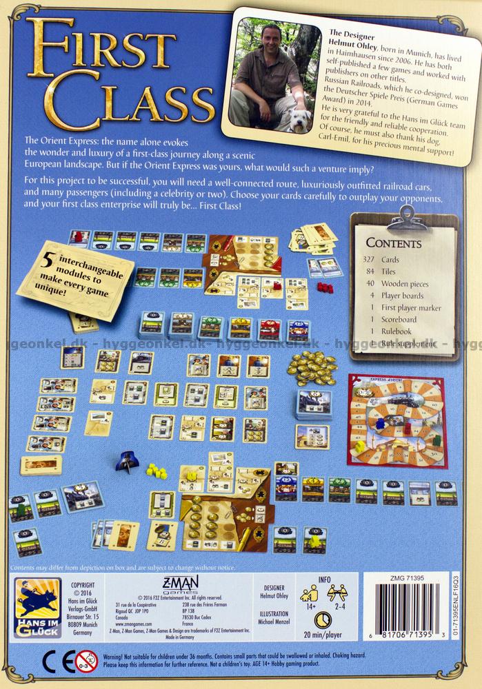 First Class är ett kortspel, som mer påminner om ett brädspel. Eftersom man i varje spelomgång endast använder grundspelets kort tillsammans med två av fem medföljande moduler bjuder spelet på mängder av variation.