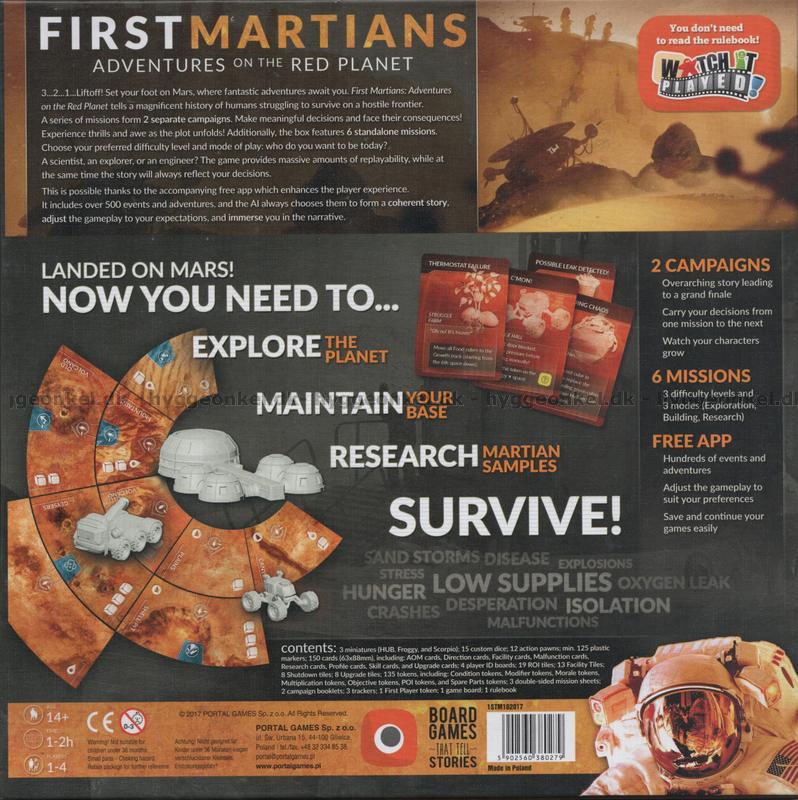 I First Martians ska spelarna hantera de tuffa förhållandena på Mars och ta del av en mängd nya äventyr och utmaningar. Spelupplevelsen förbättras ytterligare av den integrerade appen som ger utmaningar genom spelet och hjälper till att skapa balans.