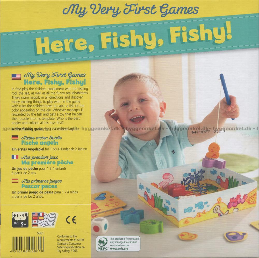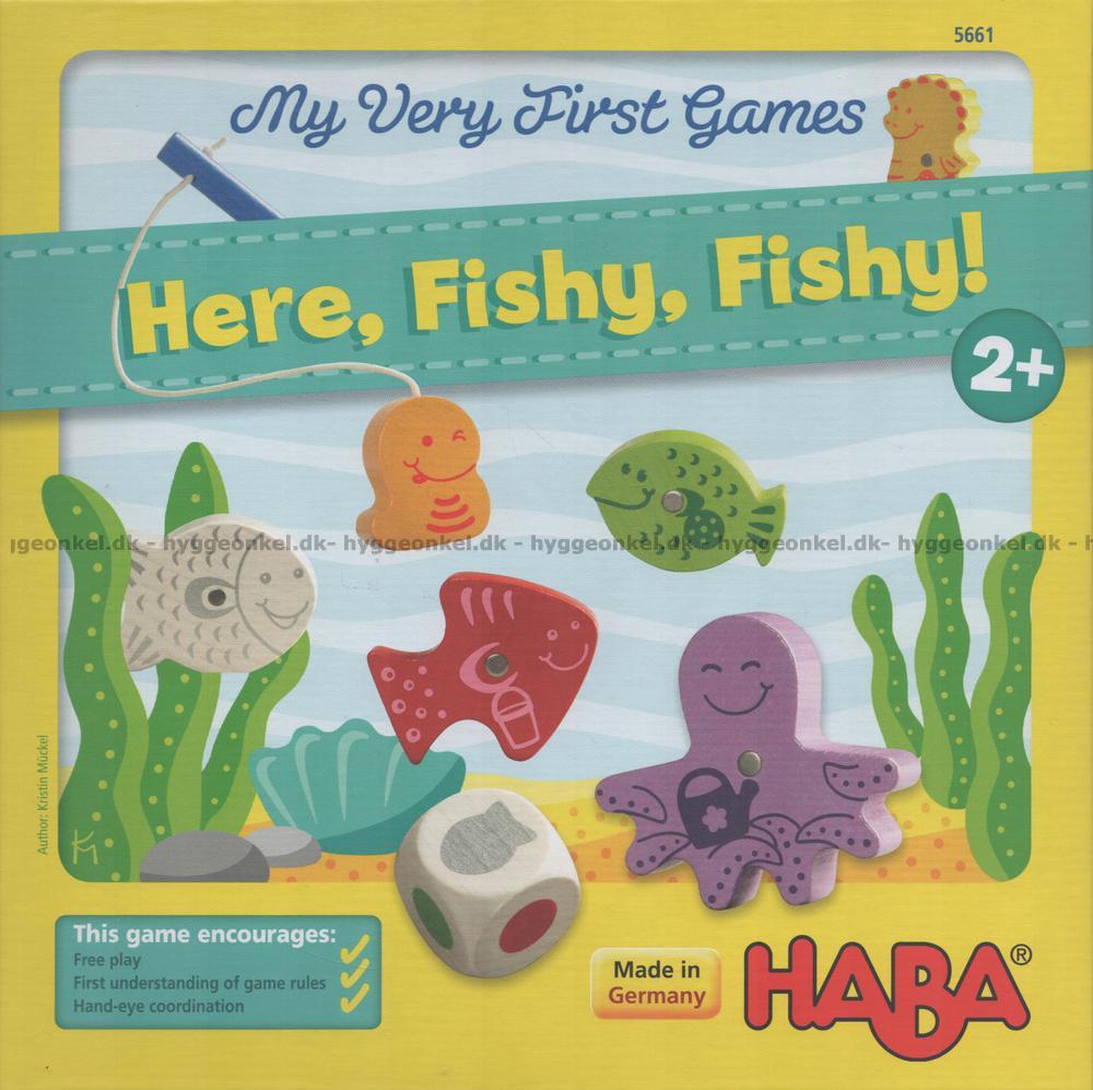 Here, Fishy, Fishy! är ett barnspel för barn från 2 år. I detta fina fiskespel ska man kasta en tärning och sedan se vilken fisk man ska försöka att fånga.