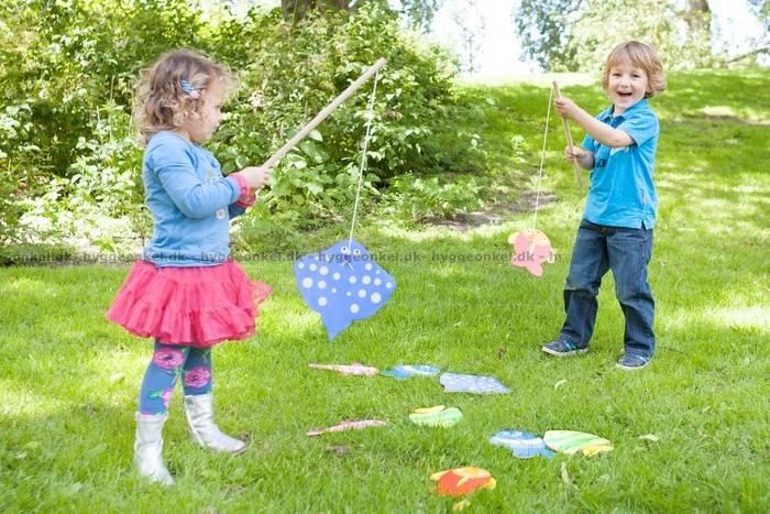 Lägg ut fiskarna på golvet eller på gräsmattan och försök att med metspöt få så många fiskar på kroken som möjligt.