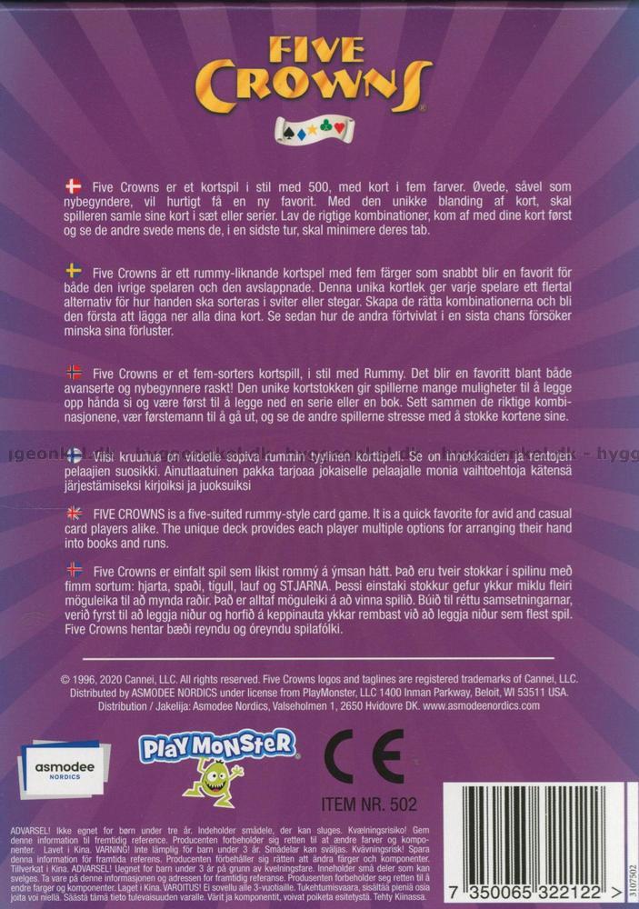 Spelet påminner om det klassiska "500". Dock finns i Five Crowns 5 kulörer – de fyra välkända spader, klöver, hjärter och ruter, samt dessutom stjärnor.