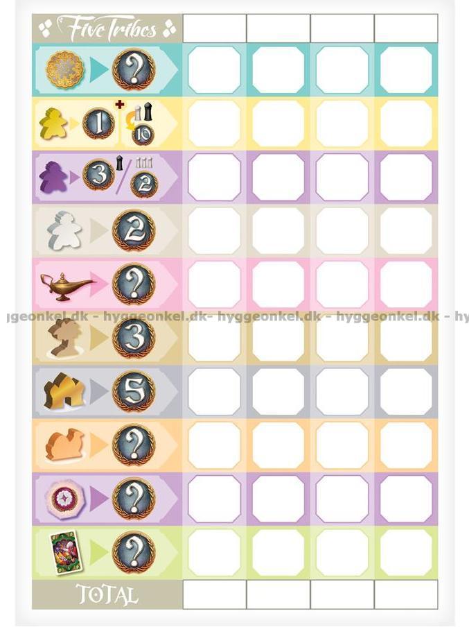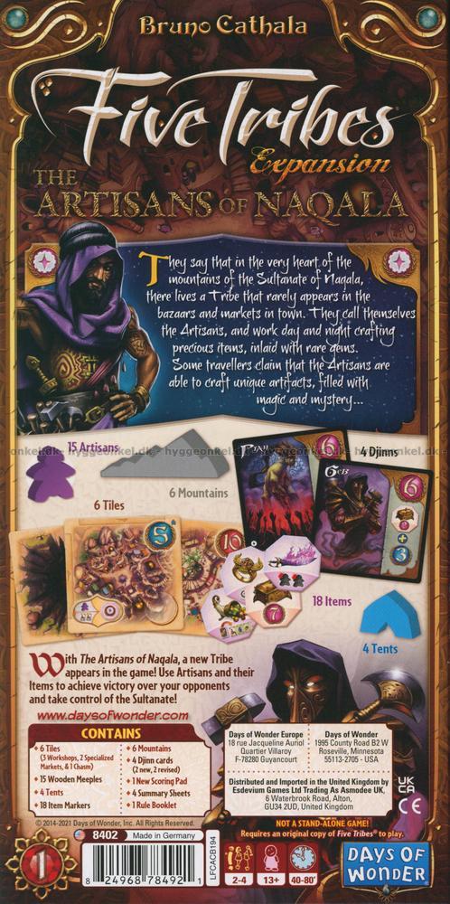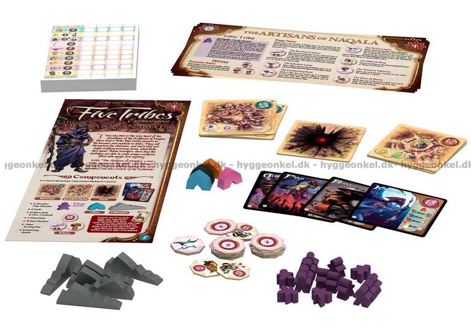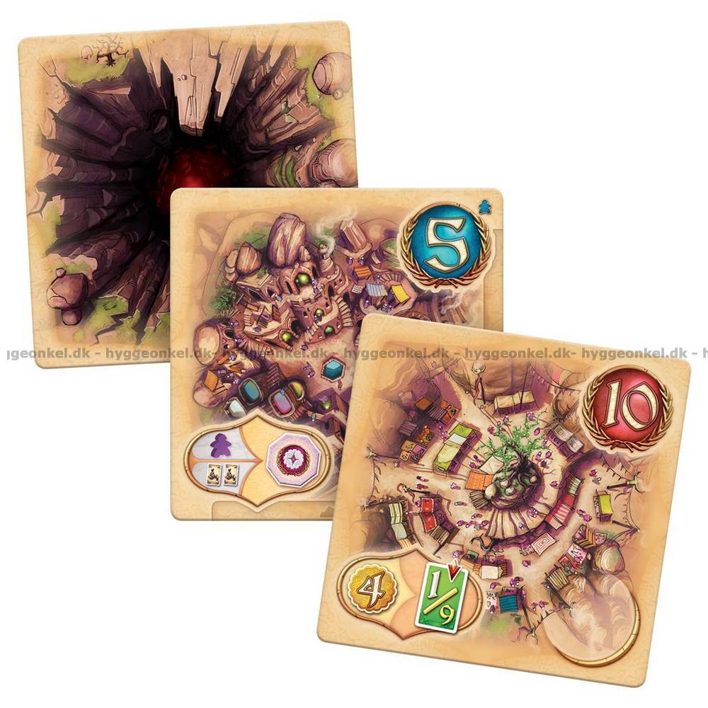 Asken innehåller 6 tiles, 15 pjäser i trä, 4 tält, 18 marker, 6 berg, 4 Djinn-kort, 1 nytt poängblock, 4 sammanfattningsark och spelregler.
