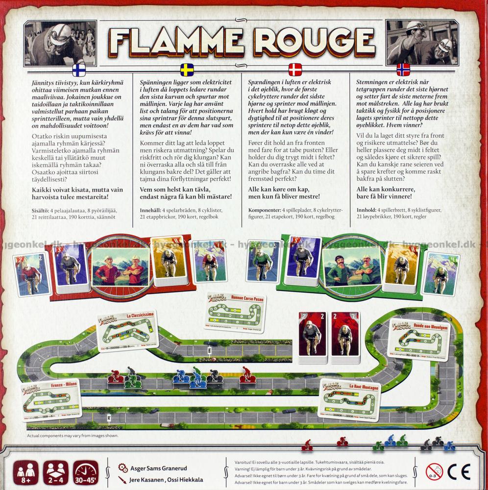 Flamme Rouge är benämningen på det märke som markerar att det endast återstår 1 km av loppet. I detta spel kämpar ni om att få just en av era cyklister först över mållinjen.