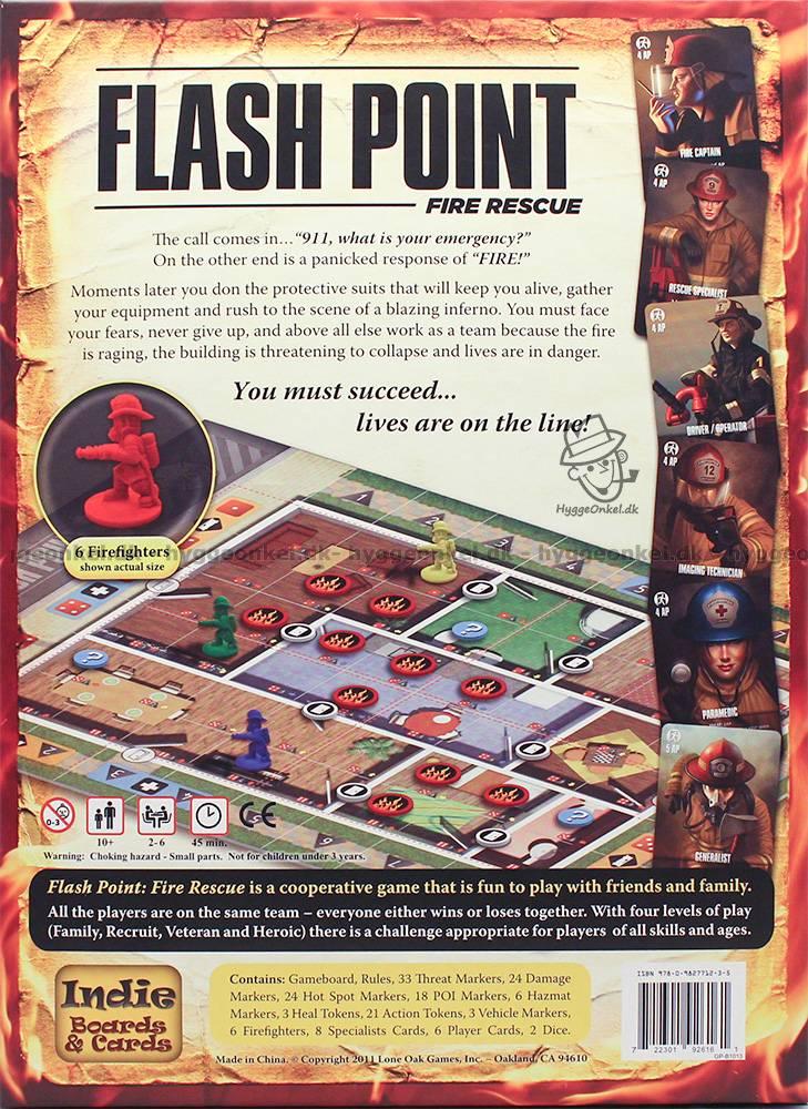 Asken inkluderar ett spelbräde, marker, 6 pjäser (brandmän), kort och 2 tärningar.