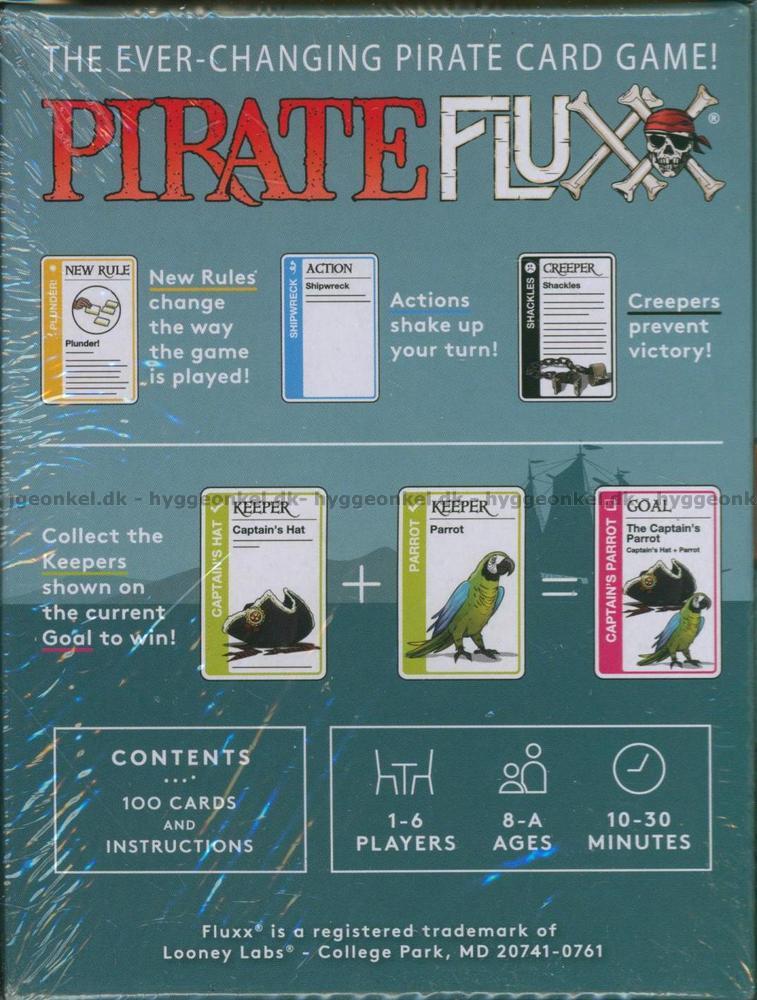 Den populära spelidén Fluxx finns nu med pirater. Ta befäl med kaptenshatten, men se upp för skörbjugg och myterier som kan kosta dig segern. Sno åt dig den största delen av bytena samt några skepp och var på din vakt mot överraskande kort.