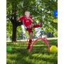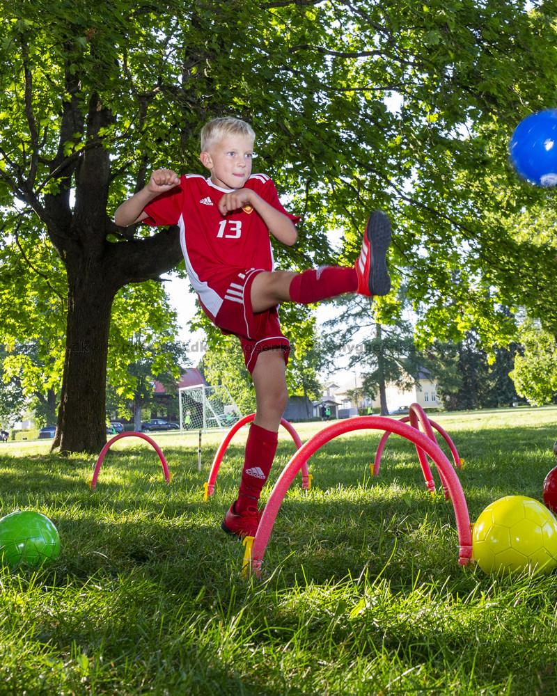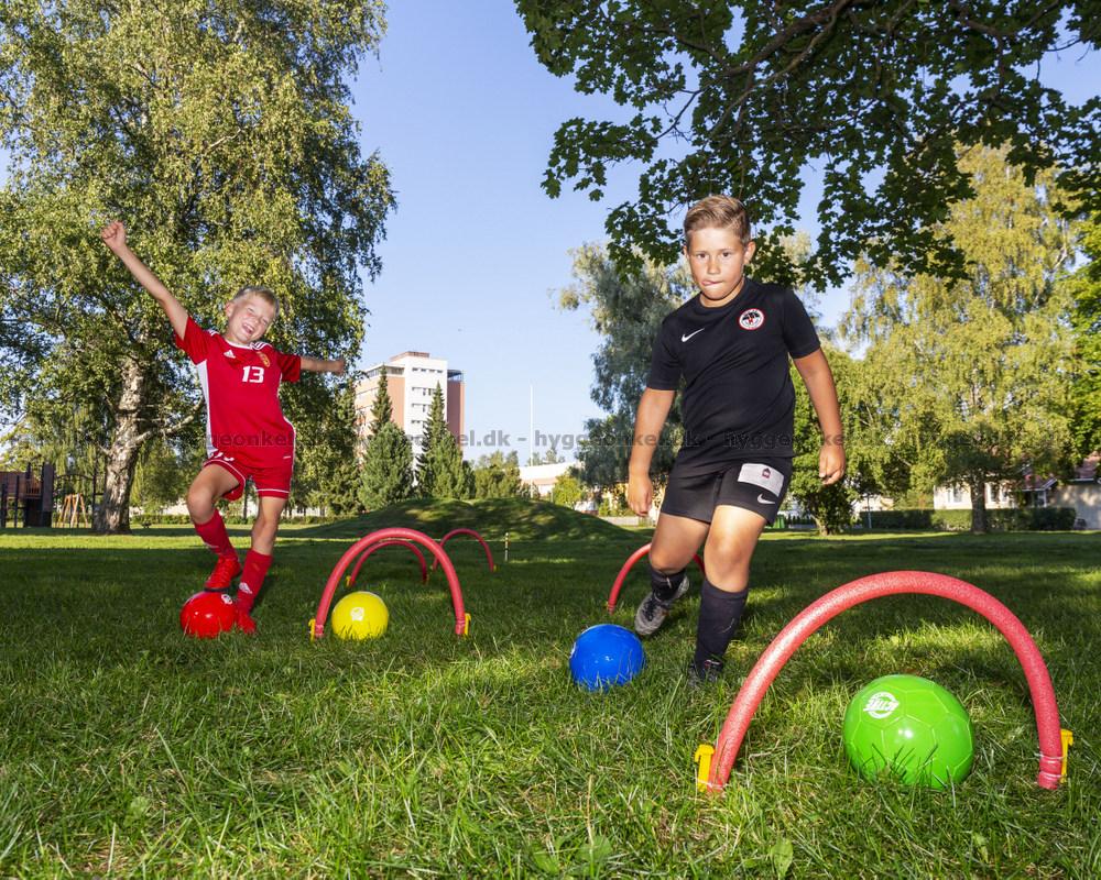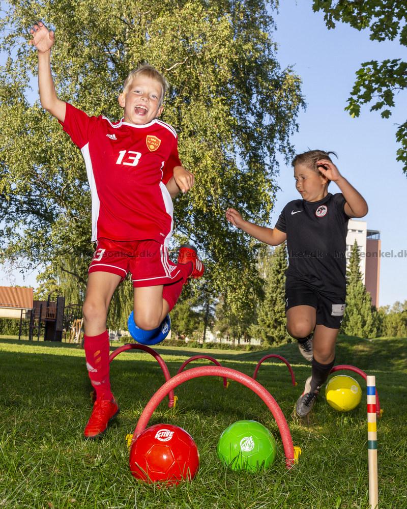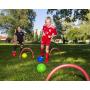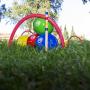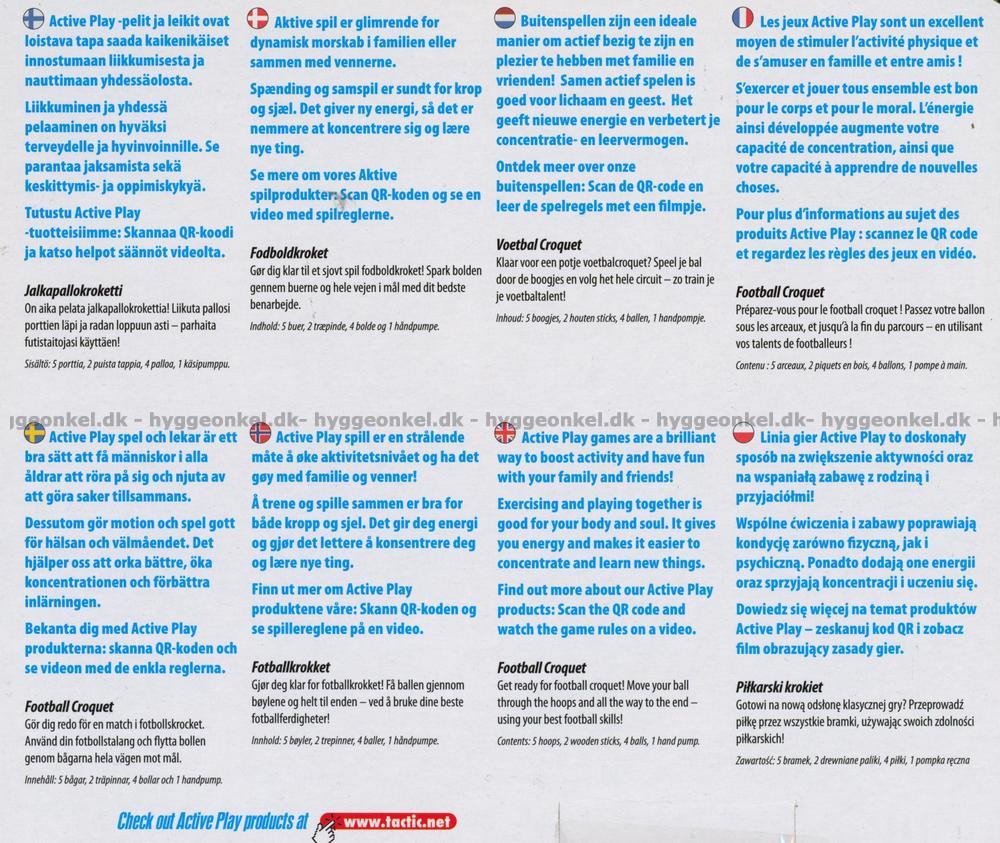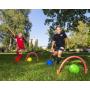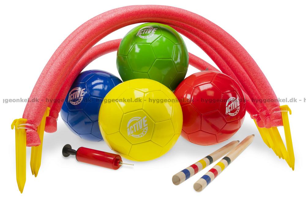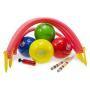 5 bågar att skjuta bollarna igenom och 2 målpinnar.