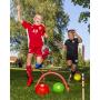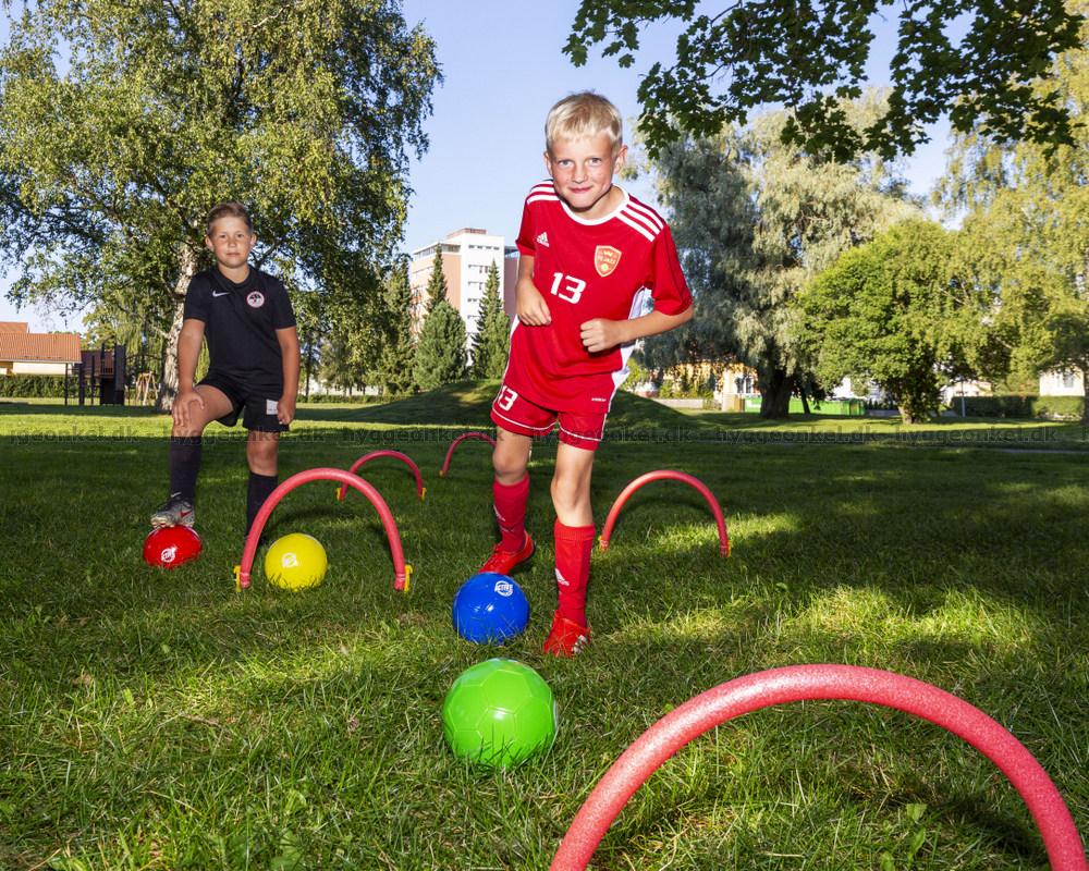 4 fotbollar i läderimitation. Bollarna har en diameter på cirka 20 cm. De ska pumpas upp innan de kan användas - pump medföljer!