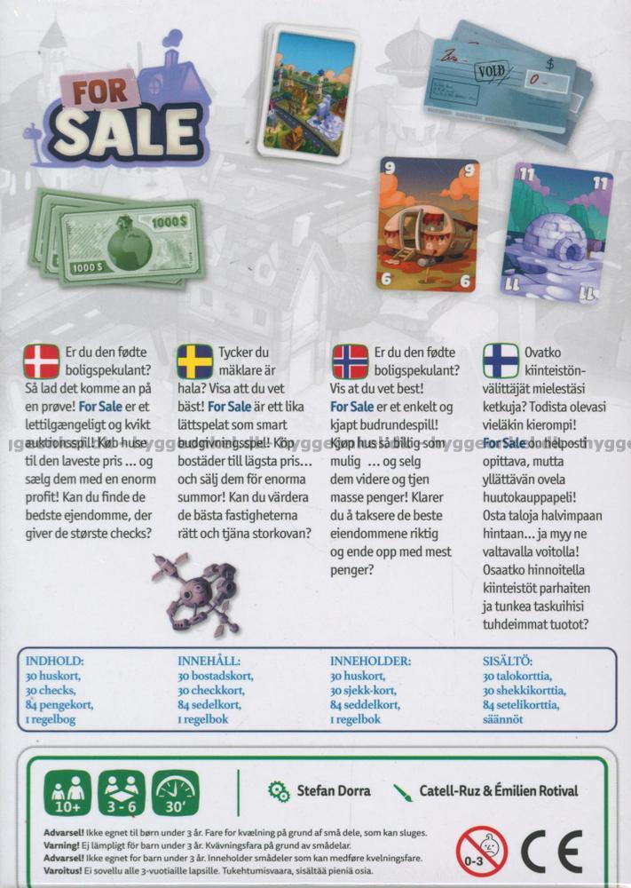 I "For Sale" gäller det att buda på de olika byggnader som kommer ut till försäljning på bordet. Det gäller att köpa dem så billigt som möjligt och sälja dem så dyrt som möjligt.