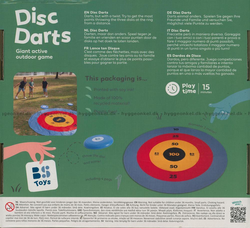 4 plastpinnar för att fästa poängtavlan i marken eller sanden (även om tillverkaren visar metallpinnar på baksidan av asken, så är det plastpinnar som ingår i lådan).