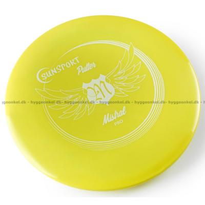 Här får du en gul frisbee med en diameter på cirka 21 cm.