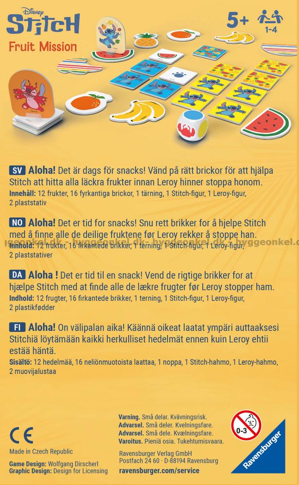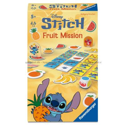 Fruit Mission: Stitch är ett samarbetsspel där alla spelar tillsammans mot spelet. Spänningen stiger för varje tur när ni försöker minnas var brickorna ligger och hjälpa Stitch att samla alla frukterna innan det är för sent.