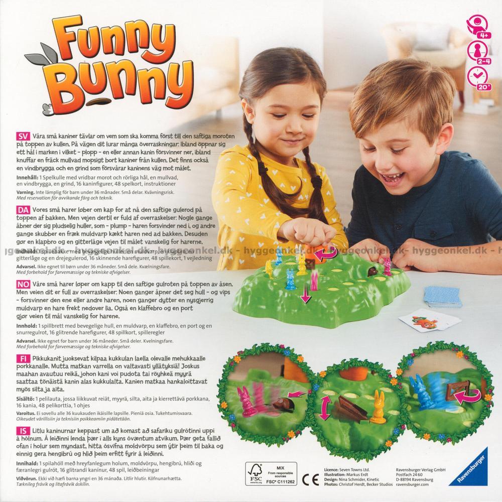 I kartongen hittar du en grön kulle (i plast), 16 kaniner i 4 olika färger, 24 kort samt givetvis ett häfte med svenska spelregler.