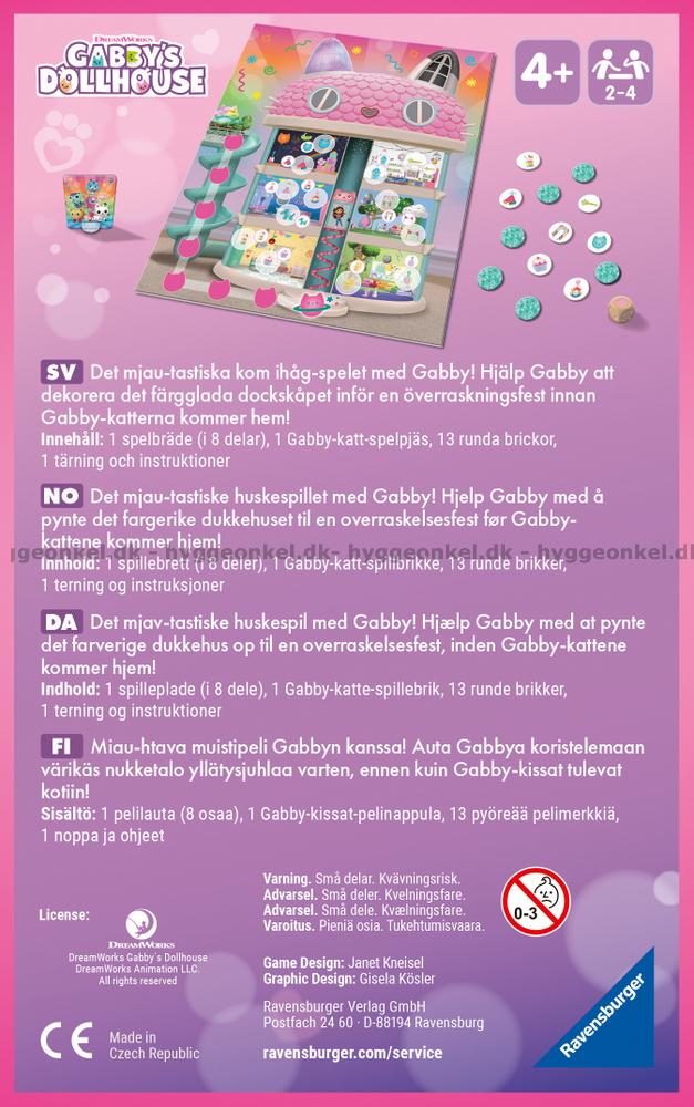 Gabbys Dockhush: Hjälp Gabby är ett mysigt och samarbetsbaserat minnesspel där barnen tillsammans hjälper Gabby att göra dockhuset redo för en överraskningsfest för Gabby-katterna.