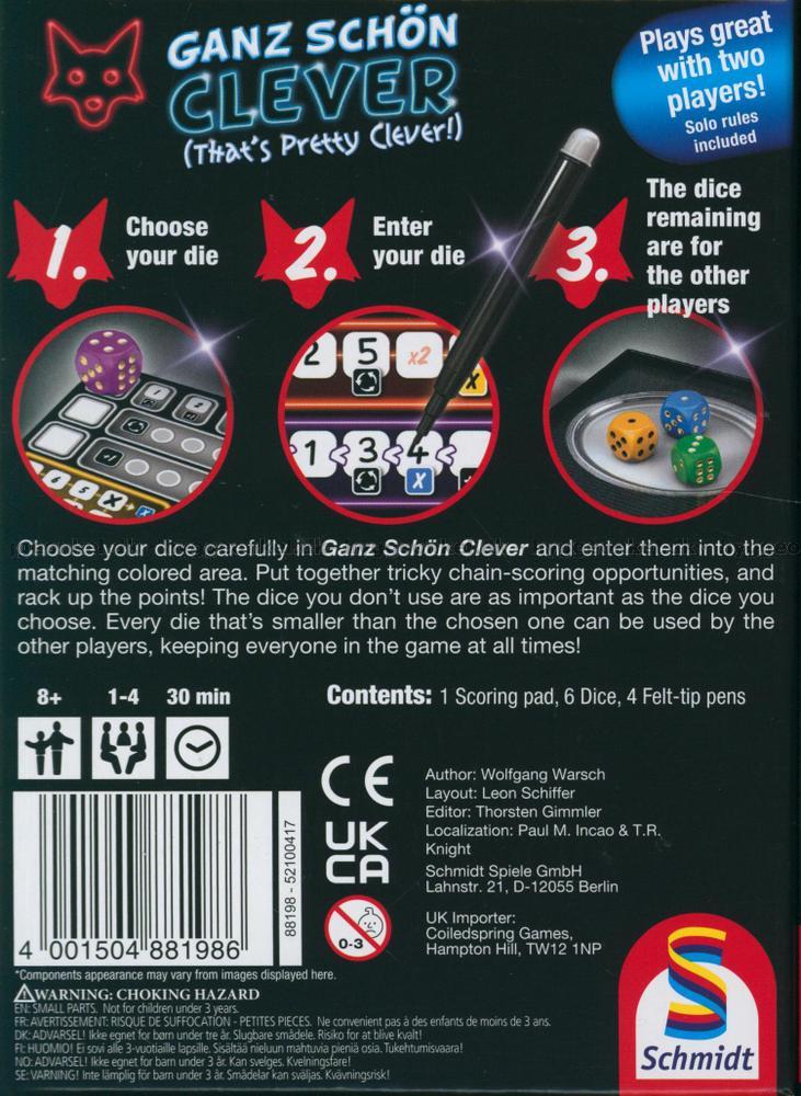 Ganz schön clever är ett spännande tärningsspel i vilket alla deltagare är igång hela tiden. Du måste vara vaken - även när det inte är din tur att kasta tärningarna!