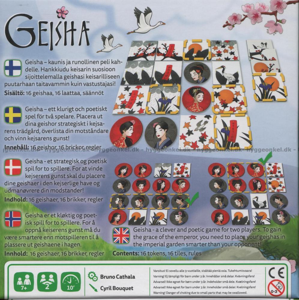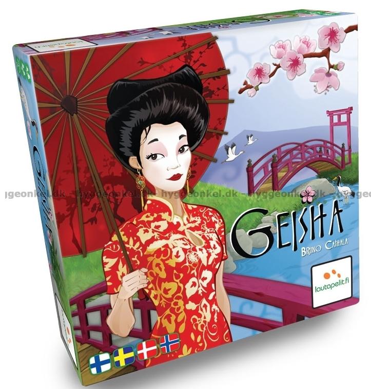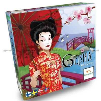 I det vackra och poetiska spelet Geisha får varje spelare en rad brickor med olika fina motiv av geishor. Dessa brickor ska placeras på bästa möjliga sätt i kejsarens trädgård. Man kan också försöka att förhindra motståndaren att placera en bricka.